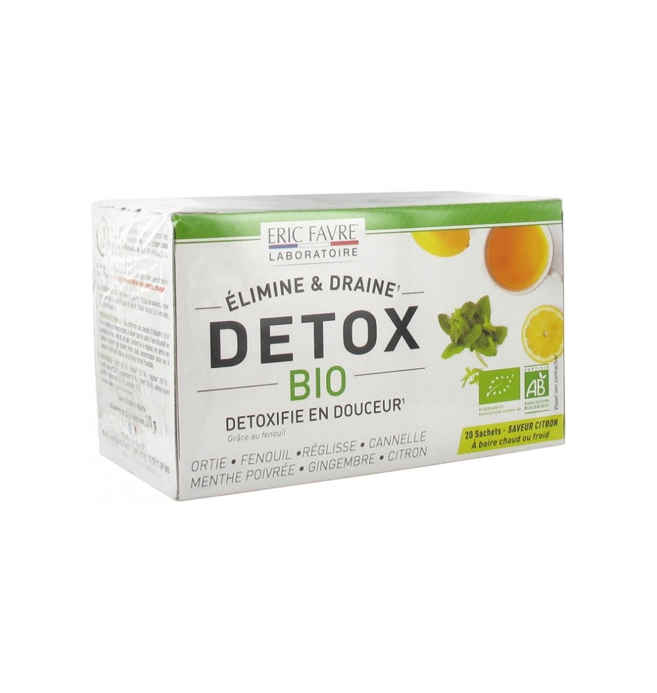 Eric Favre Detox Élimine et Draine Bio 20 Sachets est une tisane formulée à base de plantes naturelles sélectionnées certifiés AB, dont le fenouil qui facilite l'élimination urinaire, drainant.